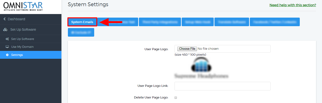 4. Once you have updated the thank you page code with the email variable, every single customer that orders from your store will automatically be registered as a referral partner. They will also automatically receive a welcome email providing them with their referral link and login link to their user dash board. To edit this email, get into your Admin Dashboard, go to Set Up Software -> Settings, click on "System Emails".
