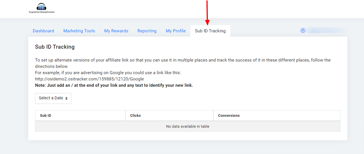 Now the User Dashboard where you can see Sub ID tracking is activated, click on "Sub ID Tracking".