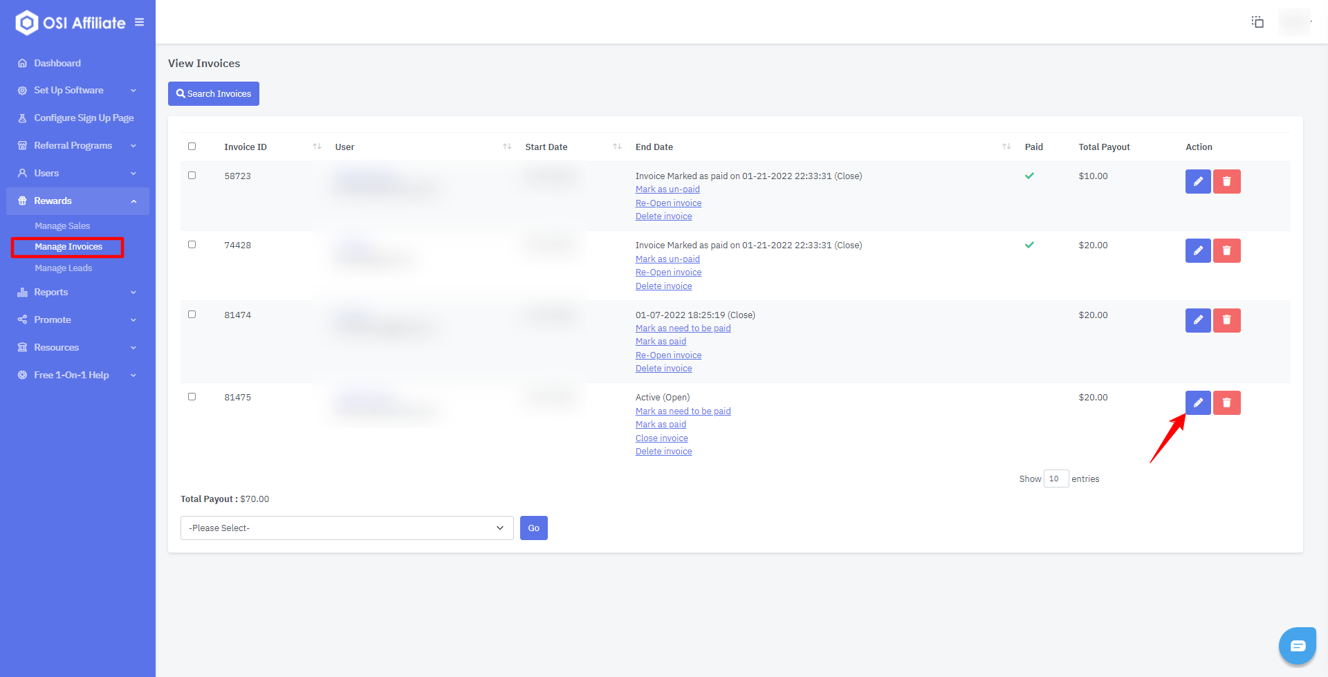 Step 3. Click on Blue pencil icon of the invoice that has the refunded sale.