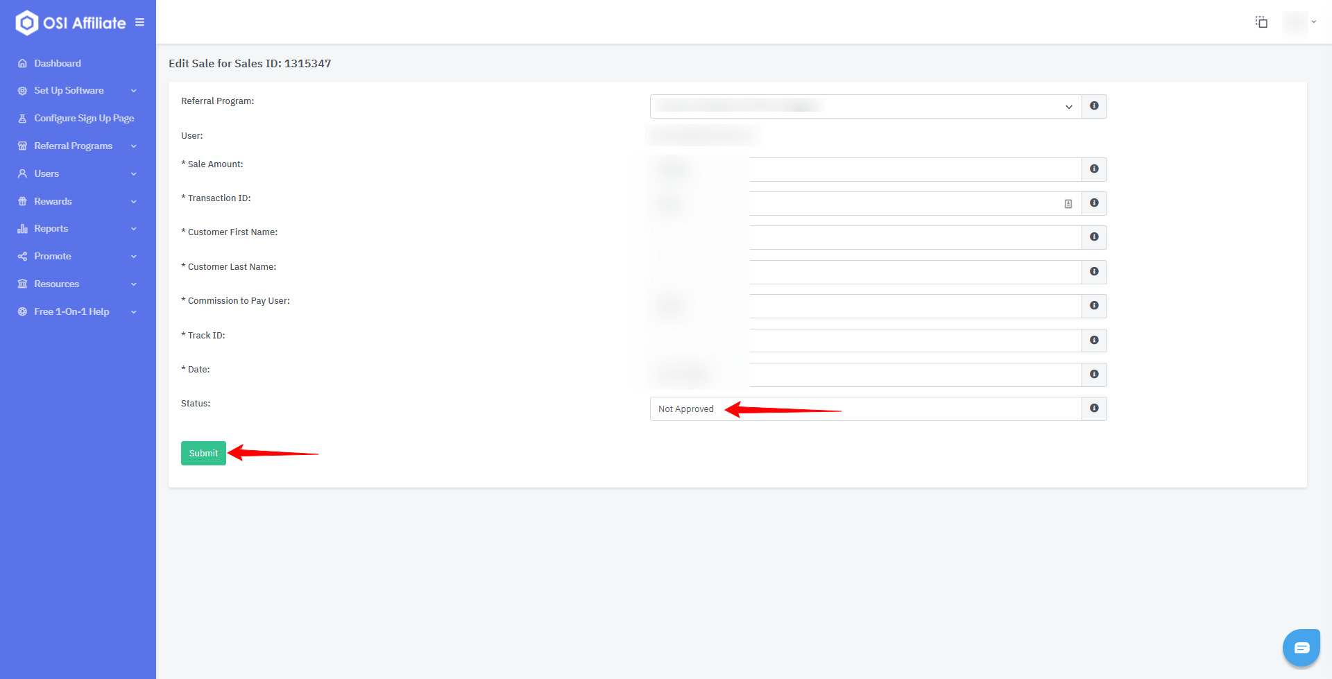 Step 5. Change the status of the refunded sale from Approved to Not Approved and then click on Submit button.