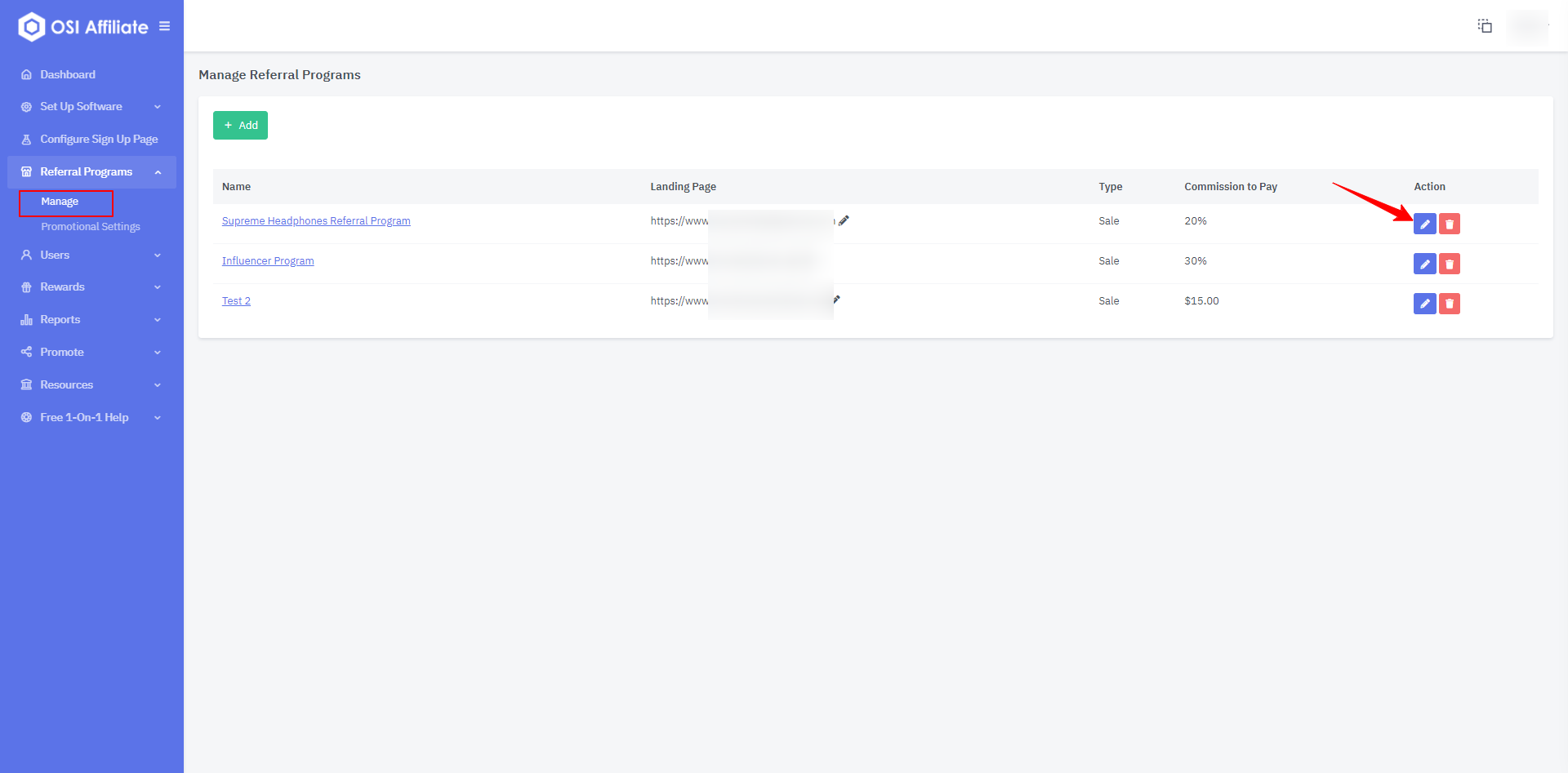 2. Under "Manage Referral Programs", click the "Edit" icon across the specific Referral Program.