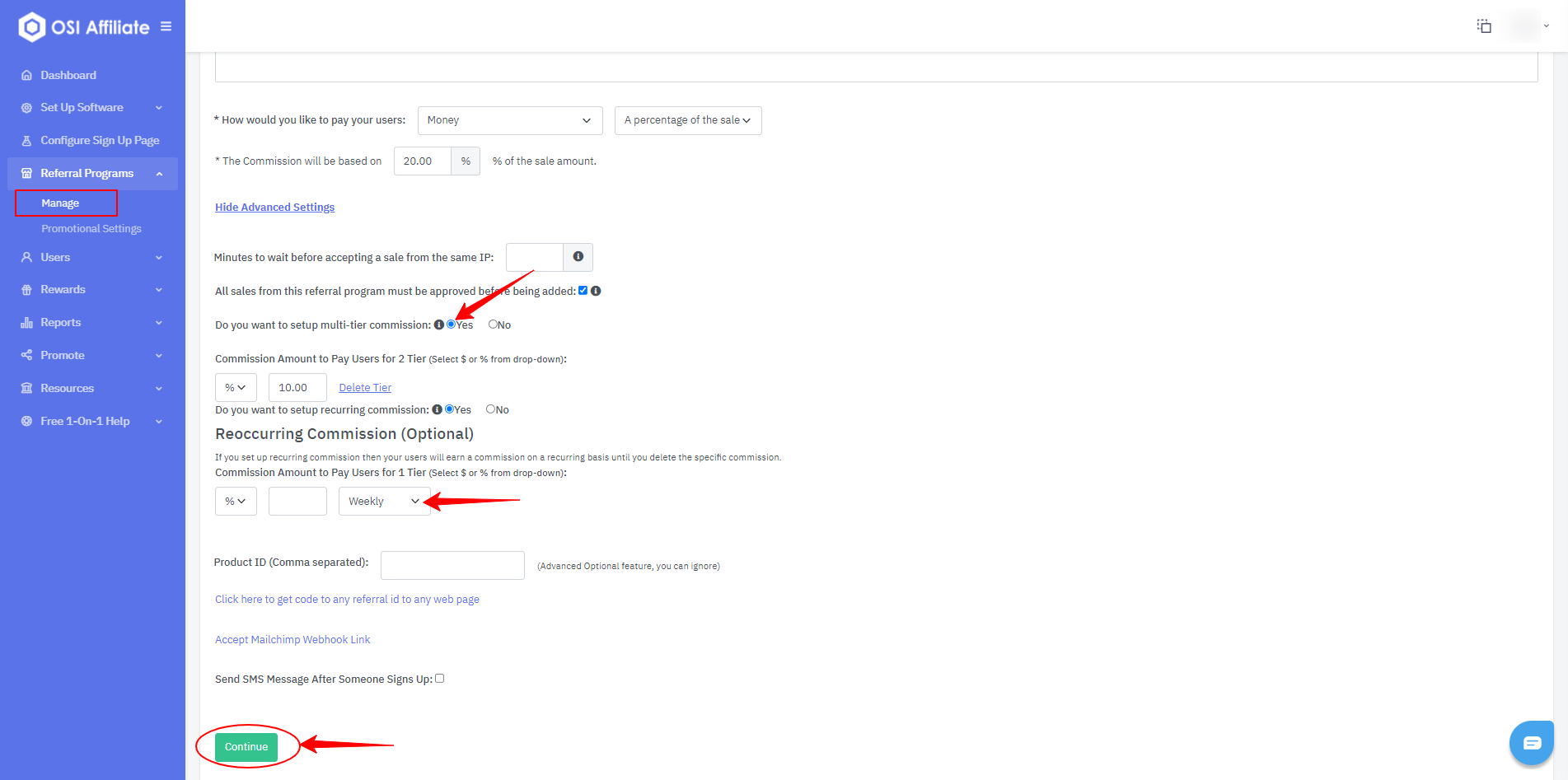 4. Select "Yes" next to the option saying "Do you want to set up recurring commission" and set your Recurring commission amount and time frame. You can select to have the commissions added Weekly, Monthly, Quarterly, Semi-Annually and Annually and click "Continue".