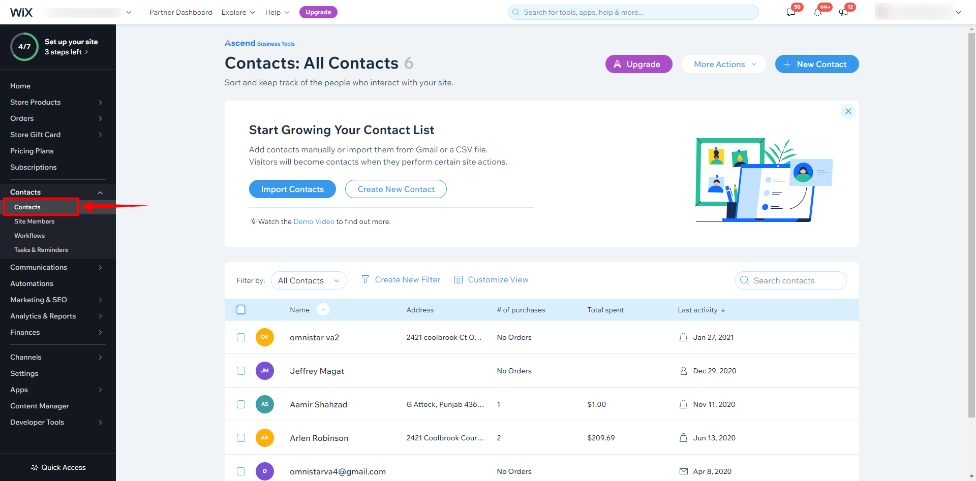 Step 4. Log in to your Wix Admin account and click on Contact. Here you can see your Contact List.